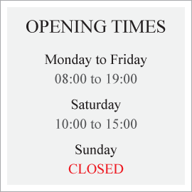 Opening Times: We are open Monday to Friday from 8:00am to 7:00pm and Saturday from 10:00am to 3:00pm. We are CLOSED on Sunday.